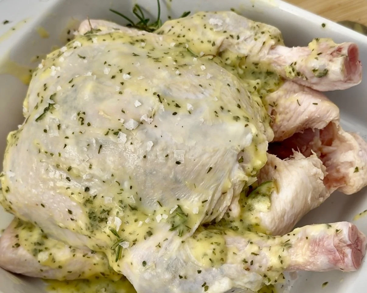 Pat the chicken dry, rub the mixture all over, under the skin and place in a roasting dish. Squeeze lemon juice over the top.